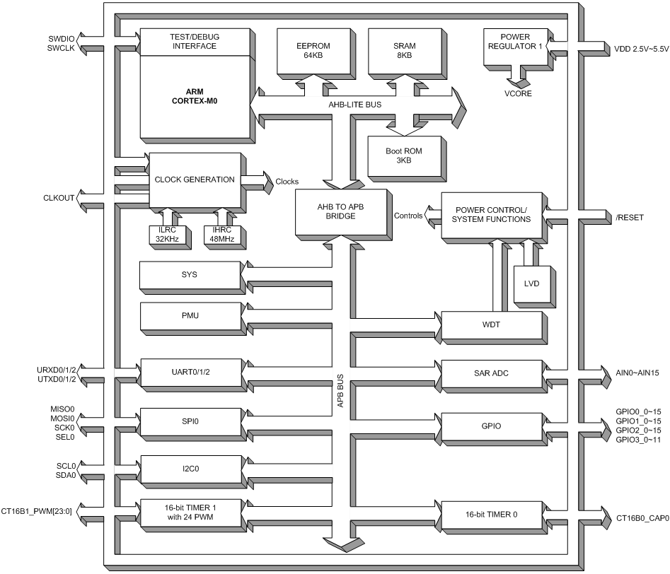 (43DMIPS)。SN32F760B系列单片机IC结构一流,包括64KB Flash ROM程序内存、8KB RAM程序内存、巢状向量中断控制单元(NVIC)、两组16位定时器、通讯接口包括一组I2C、一组SPI、三组UART以及16+1信道12位SAR