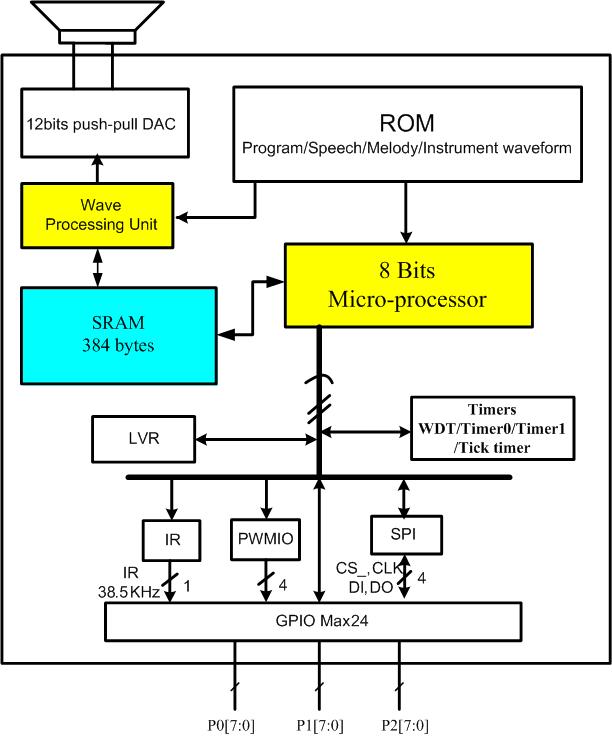 It is a multi-channel speech controller and it is an 8-bit single chip microprocessor. It contains RAM, ROM, I/Os, interrupt function and 12-bit high-quality DA. For CPU power consideration, this chip not only built-in an 8-Bits CPU but also a Wave Processing Unit (WPU). All the wave-table melody play are handled by this WPU, CPU should set-up the property initial value before wave-table melody playing. Besides, according to improvement of the CPU power, most of standard MIDI format can be acceptable through the MIDI to Melody convert software.