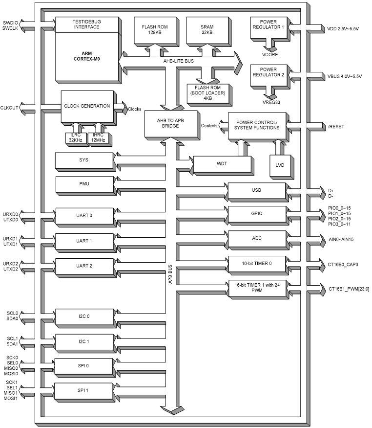 Interrupt Controller (NVIC), two 16-bit timers, I2C, SPI, UART interfaces, Full Speed