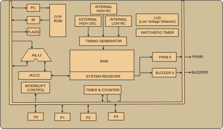 the excellent IC structure including the program memory up to 1K-word OTP ROM, data