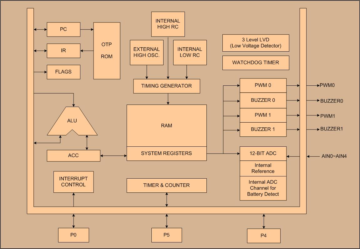 (one internal ADC channel for VDD measurement), two channels PWM output (PWM0, PWM1),