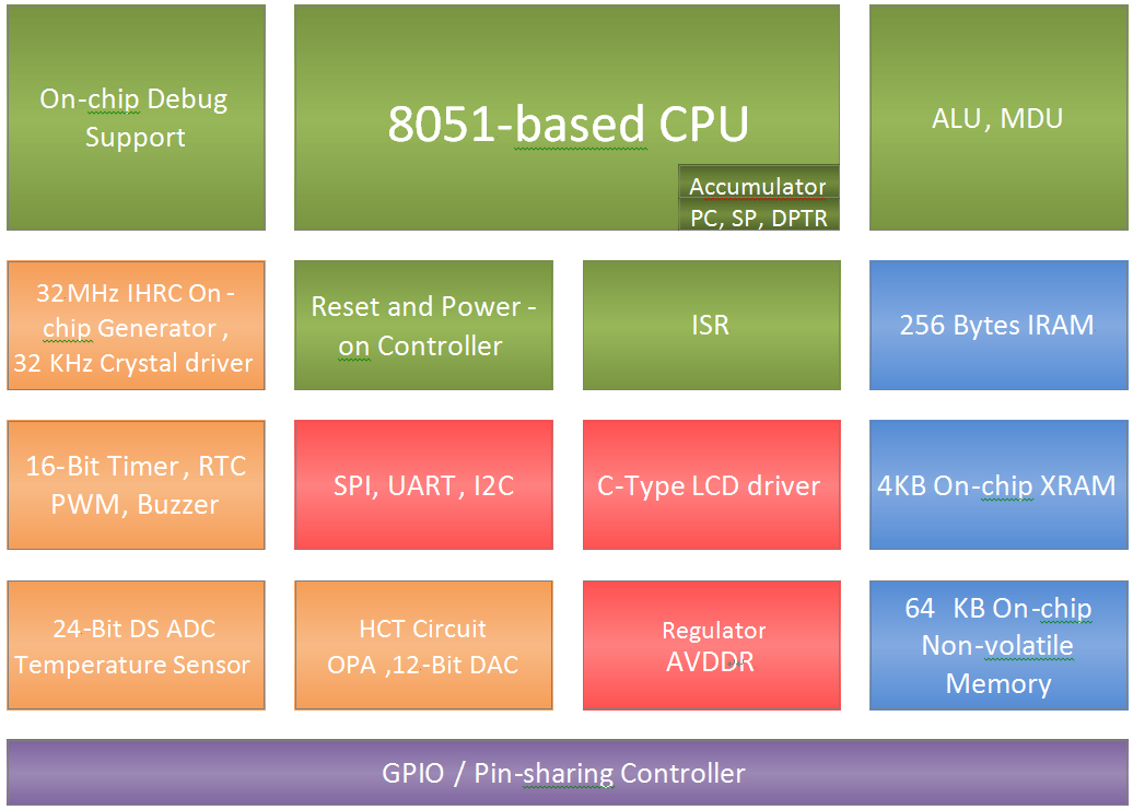 SN8F59682 is an 8-bit architecture microcontroller which compatible with MCS-51 instruction set. It runs at up to 12.1 times faster than the original 8051 at the same frequency. Meanwhile, its advanced semiconductor technology provides a wide range operation voltage, from 1.8 V to 5.5 V, and working temperature between -40°C and 105°C at 32 MHz CPU clock rate.The microcontroller builds in a 64 KB flash memory (IROM), 256 bytes internal RAM (IRAM) and 4 KB on-chip external RAM (XRAM). A Hardware MDU dramatically improves mathematical operations performance. Furthermore, a 9 input channels 24-bit resolution Delta-Sigma ADC, 12-bit DAC, dual rail to rail OPA ,4*26 or 6*24 LCD driver (144 dots), One Programmable Gain Instrument Amplifier :x1~128 , Three 16-Bit Timer/Counter with Auto reload, PWM Output function, One 8-Bit base Timer for RTC , Communication interfaces (UART*2, SPI*1, I2C*1) to fit in the vast majority of consumer electronics,、Glucose HCT meter、Thermometer、Weight scale and Medical Measurement Applications.
