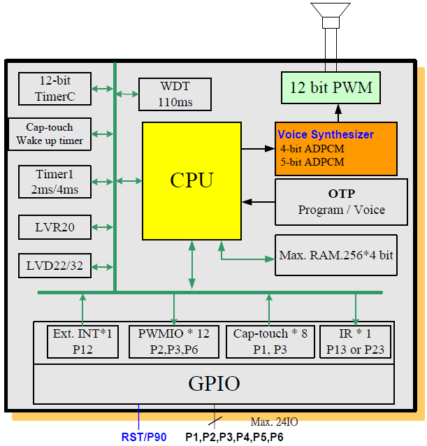 It built in a 4-bit tiny controller with one input port and 24 I/O ports. By programming