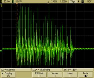 1. In home appliance application systems, the most commonly used AC to DC step-down circuit is RC method and then regulated with regulator, or step-down voltage with transformer and then use rectifier circuit to get the chip necessary DC 5V power supply. These two circuits, in AC power switch up and down time, because instant power on and power down, there may have a relatively short time of high amplitude pulse or burst on chips VDD power supply. By using Oscilloscope with high resolution, you can obviously observed pulse amplitude up to 70V or higher, as shown below: