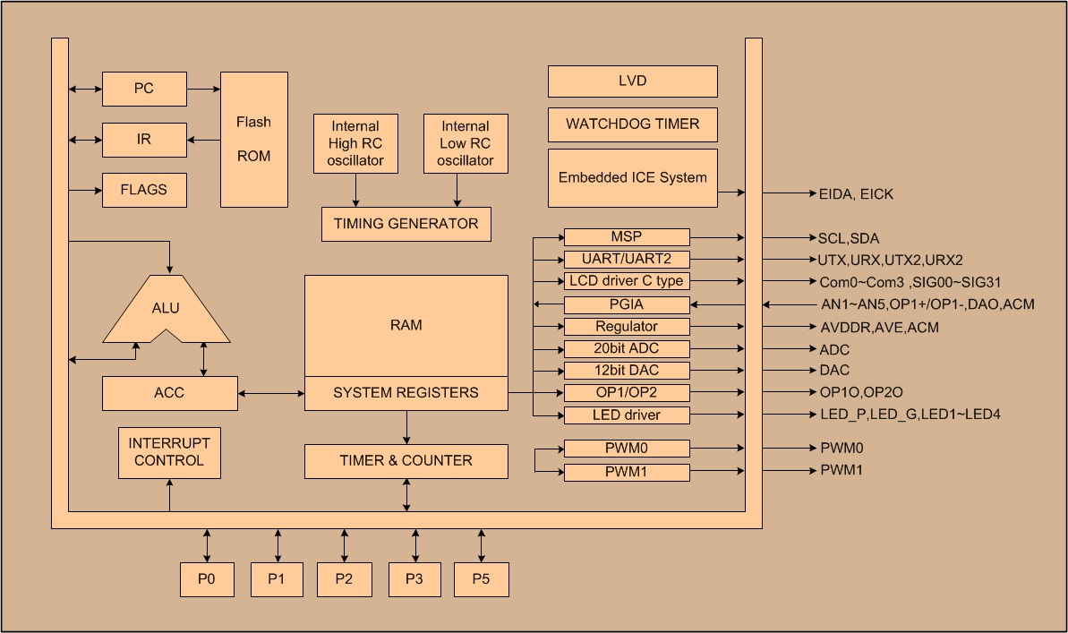 RC oscillator (IHRC 8MHz). The low-speed system clock is generated from on-chip low