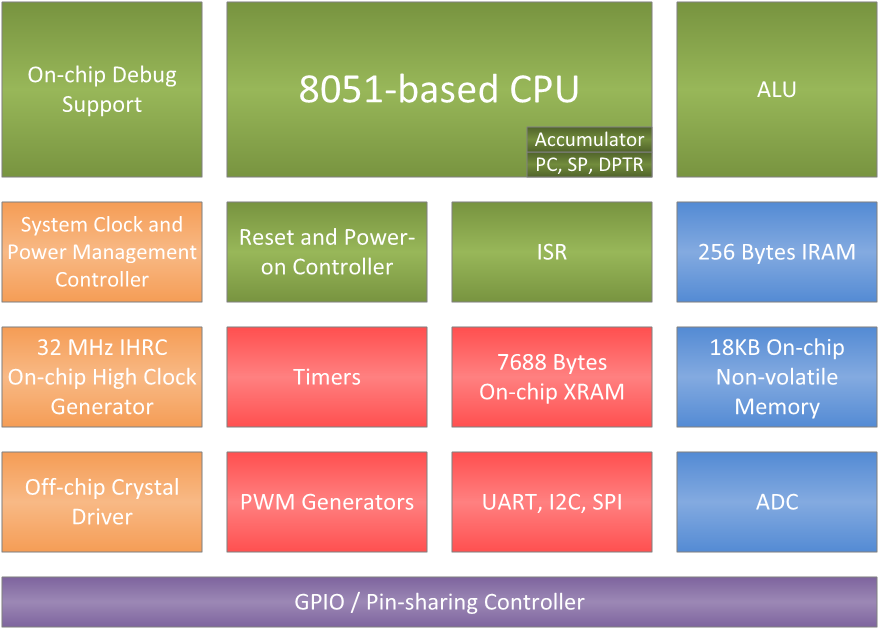 SN8F57611 is an 8-bit architecture microcontroller which compatible with MCS-51 instruction set. It runs at up to 12.1 times faster than the original 8051 at the same frequency. Meanwhile, its advanced semiconductor technology provides a wide range operation voltage, from 1.8 V to 5.5 V, and working temperature between -40°C and 105°C at 24 MHz CPU clock rate.The microcontroller builds in a 18 KB flash memory (IROM), 256 bytes internal RAM (IRAM) and 768 bytes on-chip external RAM (XRAM). Furthermore, a 12 input channels/12-bit resolution ADC, 2-set PWM generator, interfaces (2 UARTs, I2C, SPI) and 16-bit timers were designed to fit in the vast majority of consumer electronics, home automation and motor control applications.