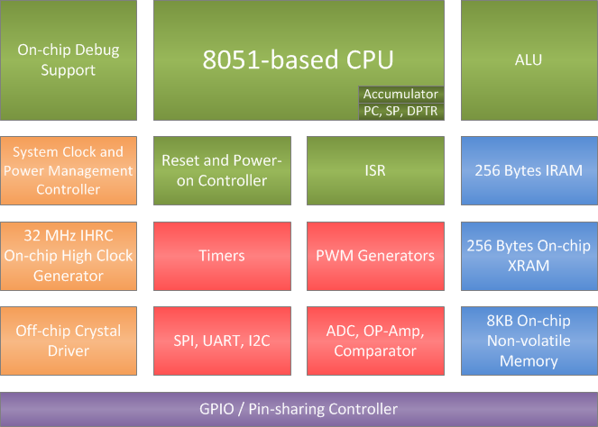 The microcontroller builds in a 8 KB flash memory (IROM), 256 bytes internal