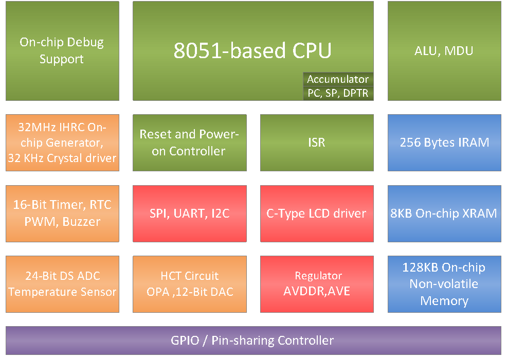 The microcontroller builds in a 128 KB flash memory (IROM), 256 bytes internal