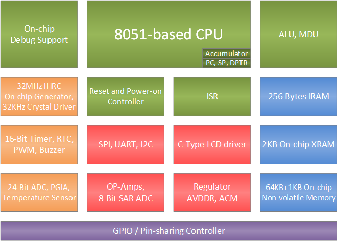 The microcontroller builds in a 64 KB flash memory (IROM), 1 KB data flash memory,