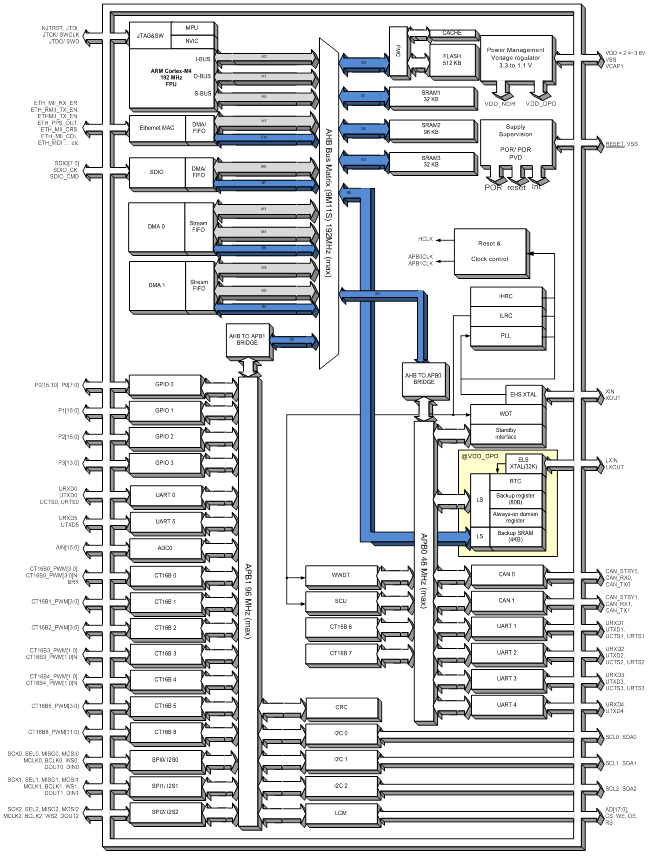 Flash ROM程序内存、160KB RAM程序内存、巢状向量中断控制单元(NVIC)、九组16位定时器、通讯接口包括三组I2C、三组SPI、六组UART、三组I2S、两组CAN