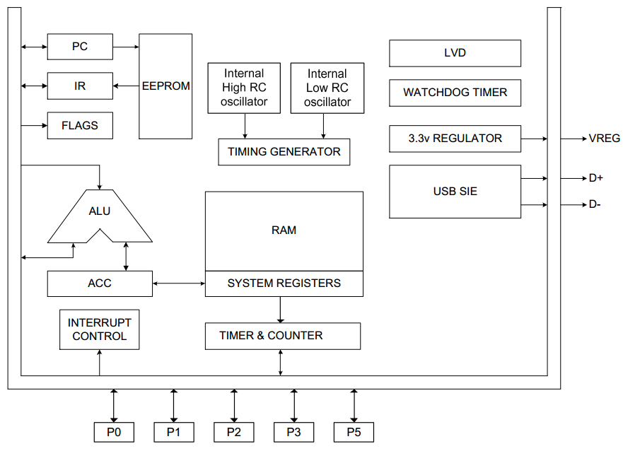 a watchdog timer, six interrupt sources (TC0, USB, NDT, Wakeup, AKA, INT0), 8-level