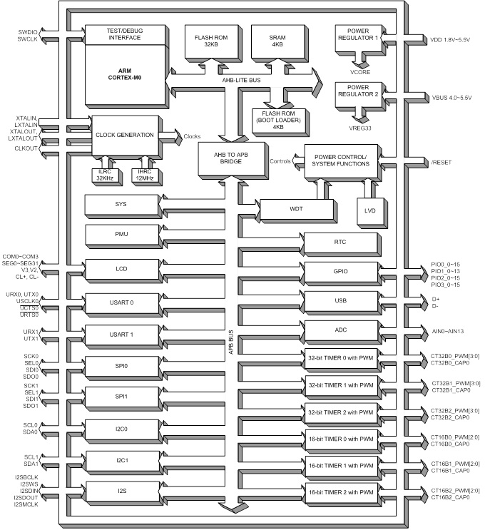 SN32F230 系列32位元USB單片機是一款全新以先進Flash ROM製程設計的低功耗、高效能產品,以ARM Cortex ™-M0 為核心,工作電壓介於1.8V~5.5V,主頻高達50MHz (45DMIPS)。SN32F760系列單片機IC結構一流,包括32KB Flash ROM程式記憶體、4KB RAM程式記憶體、巢狀向量中斷控制單元(NVIC)、16位元計時器和32位元計時器各三組、通訊介面包括兩組I2C、兩組SPI、兩組USART、一組I2S、4*32 LCD驅動器、USB 2.0全速接口,以及14通道 12位元SAR ADC。SN32F230 系列單片機擁有許多系統時鐘來源,包括內部12MHz RC震盪器、內部32KHz RC 震盪器、外部高/低速crystal震盪器和內部PLL. 在此Flash ROM 平台下, SN32F230 系列單片機內置線上編程功能(ISP),可擴展為EEPROM應用。強大的功能、高可靠性和低功耗可以在電池場合輕鬆應用。