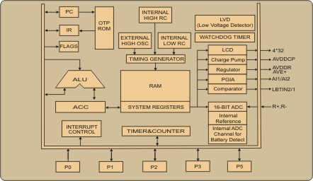 LCD driver,8層堆疊暫存器。 此外,用戶還可以自行選擇晶片的振盪形式,有兩種不同的外部振盪結構提供系統時鐘:外部4MHz高低速晶體振盪器,陶瓷諧振器及內部高速4MHz