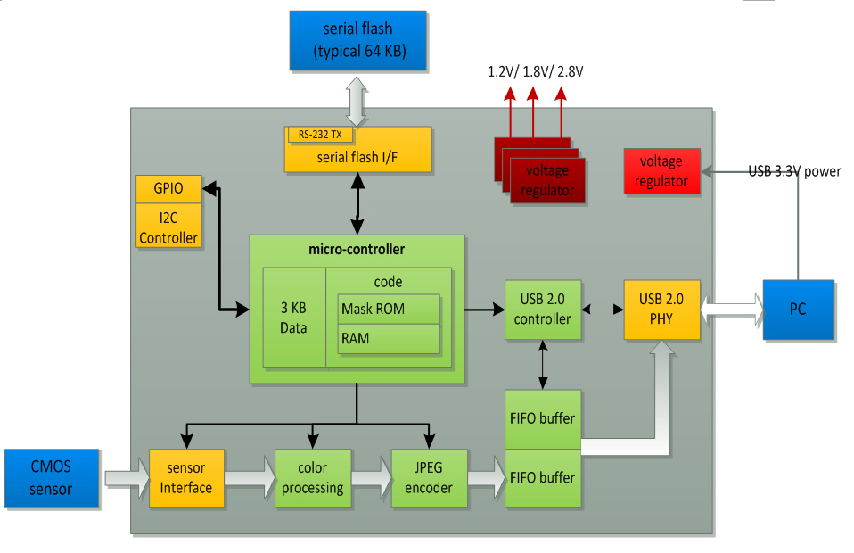 The SN9C270A is a USB 2.0 High-Speed (HS) compatible PC camera controller. The low power design provides extreme low consumption on device standby, operation and even high performance state. The low thermal design gets the module operating temperature inside platform under reasonable range. The SN9C270A is fully compliant with USB Video Class. The OS systems supported are including Windows XP, Windows Vista, Windows 7 and the coming Windows 8.The new generation image signal processing engine brings sight video experience. The high performance Motion-JPEG compression engine makes variant compression ratio to consider bandwidth requirement well which output MJPG data format. It is also a high performance and high speed transmission engine on YUV un-compression data format. With the integrated sensor interface and color processing engine, it can supports most available CMOS sensors that range from VGA to SXGA. It is controlled by the embedded micro-controller and the statistics for 3A (AE / AWB / AF) are built-in.