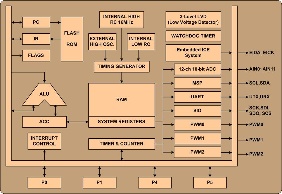 @16mips)的特點。每條指令週期就是一個時鐘週期(1T)結構提供高達16MIPS的計算能力。SN8F27E64L的IC結構一流,包括6K-word的程式記憶體(Flash